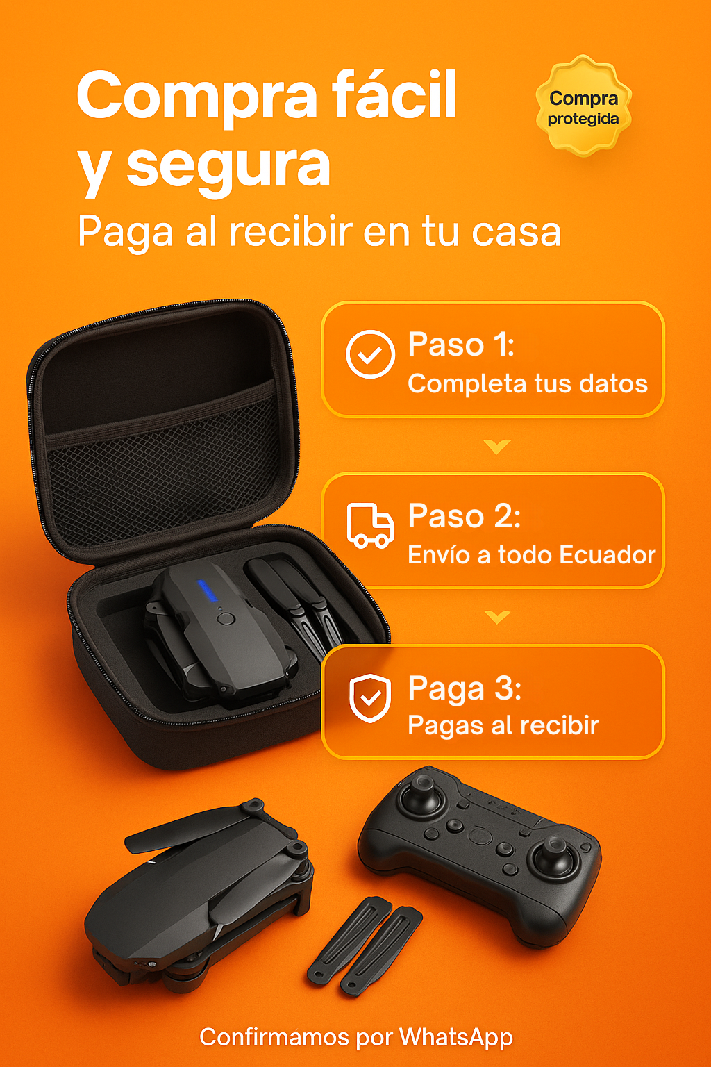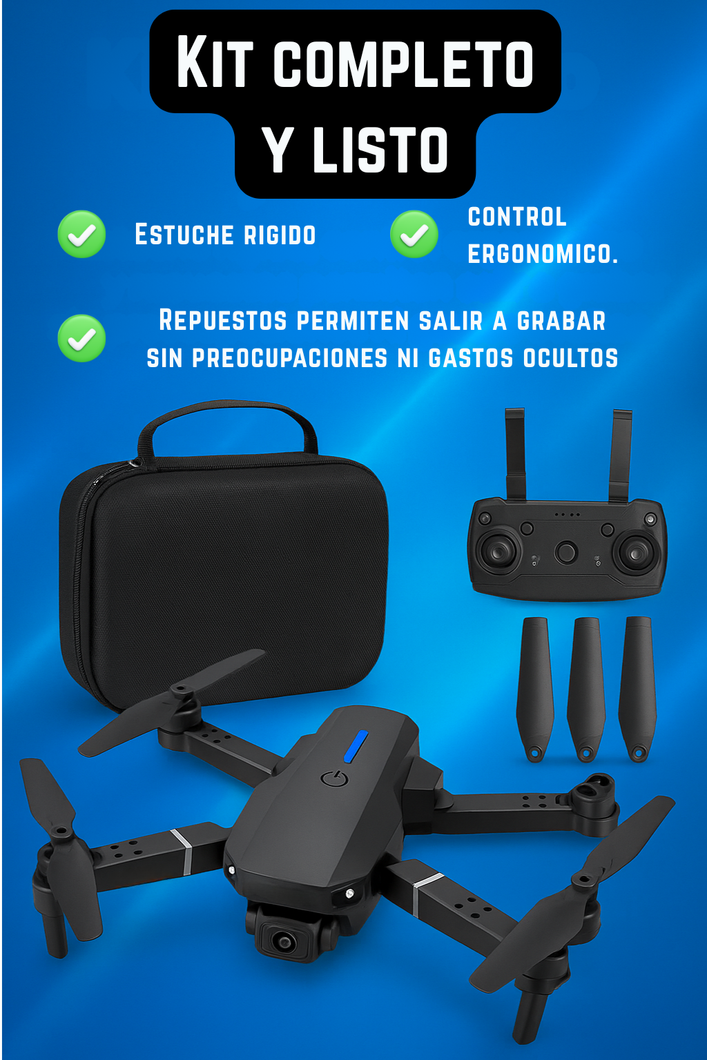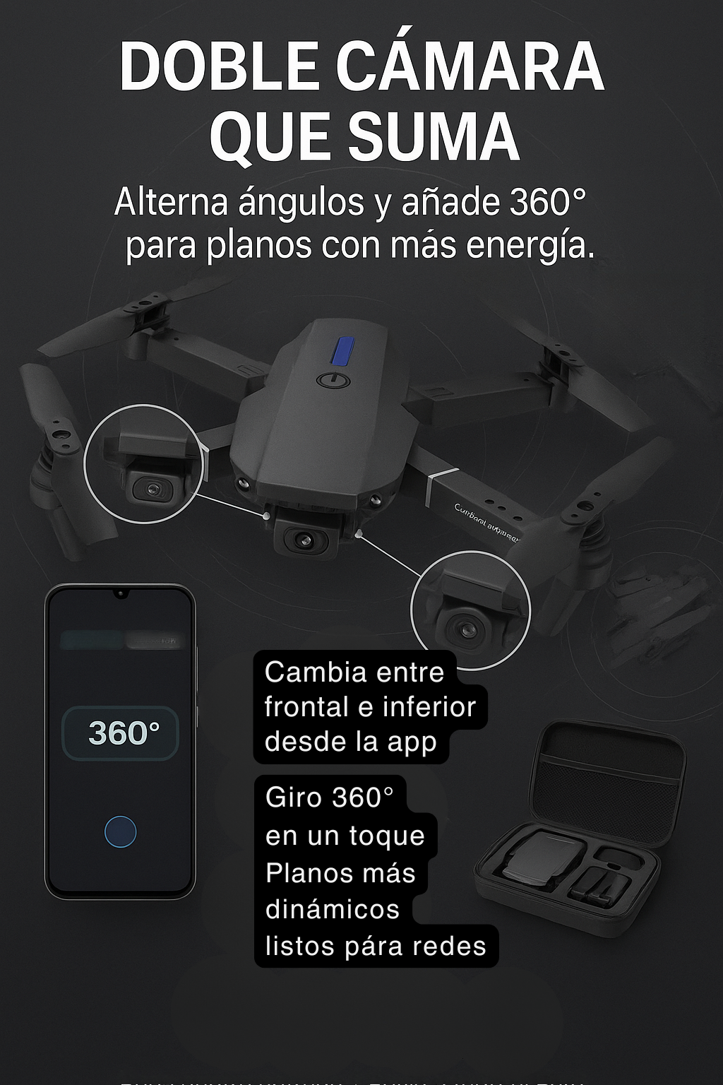El Drone E88 Pro te da tomas aéreas impactantes sin curva de aprendizaje: app intuitiva, modos inteligentes y doble cámara para crear contenido cinematográfico desde el primer vuelo. Estuche y repuestos incluidos.
