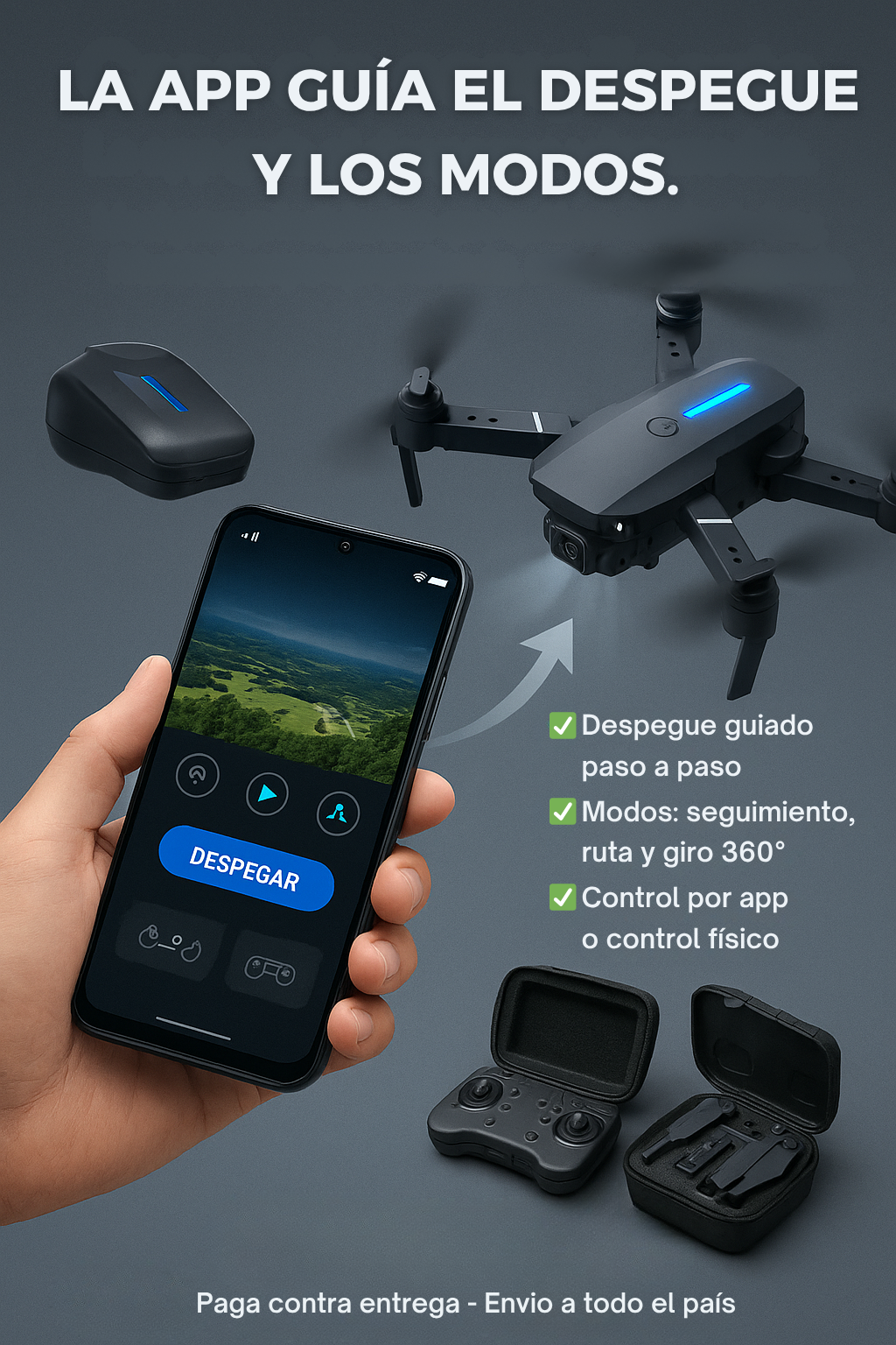 Se conecta vía wifi a tu smartphone; desde la app eliges despegue, modos preestablecidos (seguimiento, vuelo programado) y controlas doble cámara para lograr tomas diversas. El GPS/posición fija ayuda a estabilizar.